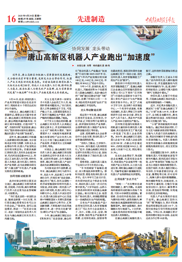 近年来,唐山高新区积极融入京津冀协同发展战略,充分借助北京市智力资源,发挥龙头企业带动作用,机器人产业呈现良好的发展态势。目前该高新区拥有机器人及相关企业超200家,形成以工业机器人为引领、特种机器人为亮点、服务机器人为特色的产业集群,成为京津冀协同发展“六链五群”中机器人产业链发展的主要承载地。